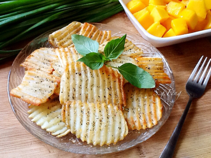 做法超簡單,免油炸,就可完成外表酥脆內鬆軟的薯片,搭配黑胡椒鹽與義大利香料,更提升了香氣與美味。