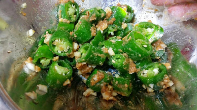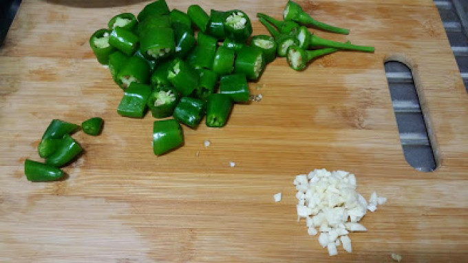 오이고추去頭去尾後切段,大約一公分寬。 蒜頭也切成末備用。
