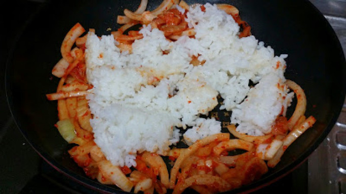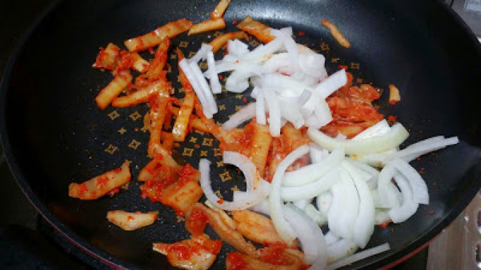 炒到泡菜有些變色香味跑出來後,加入洋蔥拌炒。