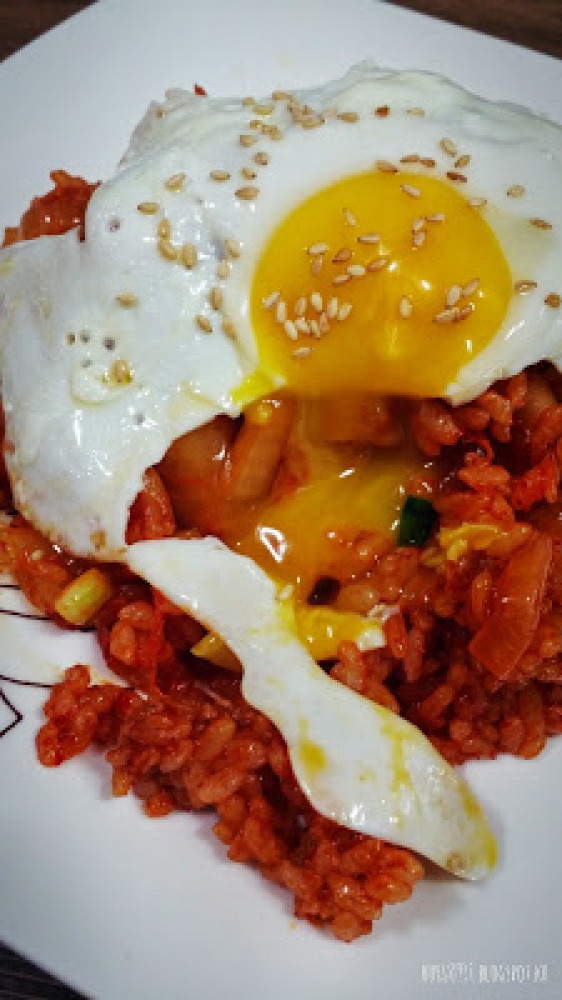 半熟的蛋黃跟甜甜辣辣的泡菜炒飯一起混合吃,真的是絕配!