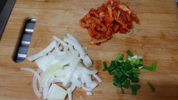 泡菜、洋蔥切絲,蔥切末備用。
