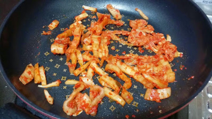 之後加入切好的泡菜拌炒。