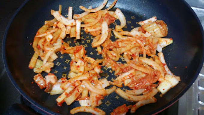 洋蔥跟泡菜均勻拌炒。