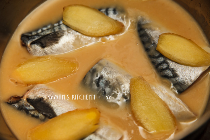 接著將鯖魚、味噌醬料和薑片都放置於鍋內,用中火煮滾後轉成小火燉煮,等味噌醬收乾成濃稠狀就完成了。