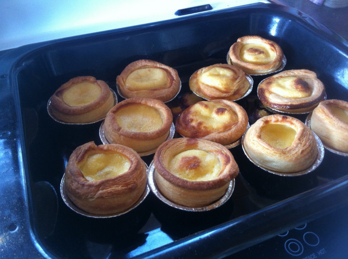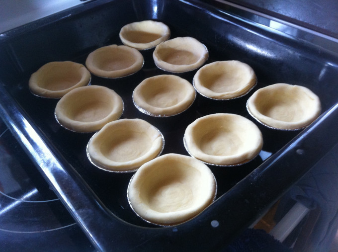 將麵團桿成約10公分的圓形,鋪於鋁箔蛋塔模內,將邊收整齊。 收邊可收高於塔模,因自製派皮在烤時會收縮。
