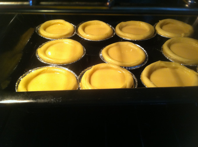 蛋液放入量杯鋪上一層餐巾紙防止倒入蛋液時空氣太多。 將蛋液倒入塔模內,勿倒太滿。