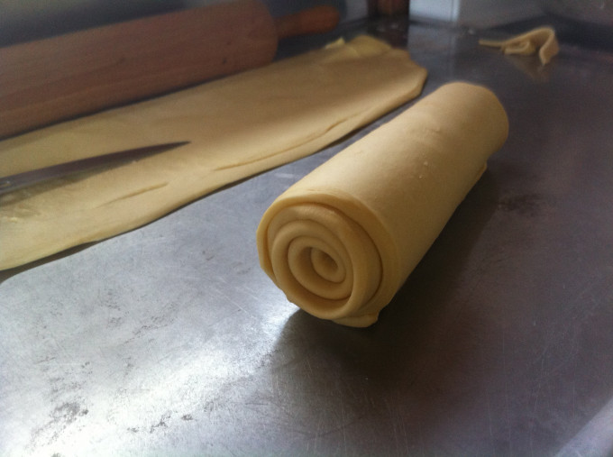 將奶油先用桿麵棍敲打軟,移除保鮮膜放上麵團中央,完全覆蓋壓緊,勿讓奶油跑出。 將麵團轉90度桿平折三折(兩側往中間),包先膜包起放入冰箱冷藏20分鐘取出,在將麵團桿平折四折(兩側折至四分之一處在對摺)放入冰箱20分鐘。 重複這樣的動作三折、四折、三折、四折、三折、四折共六次後放入冰箱至隔天使用