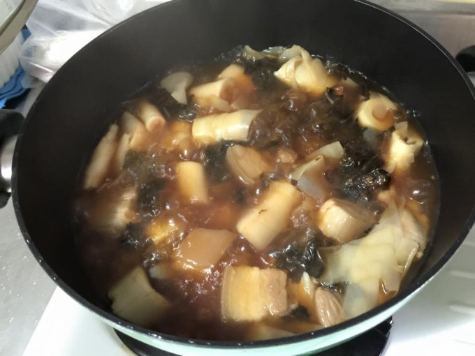 同鍋放入桂竹筍、梅干菜與豬肉,並加水到淹過食材,開大火煮滾10分鐘