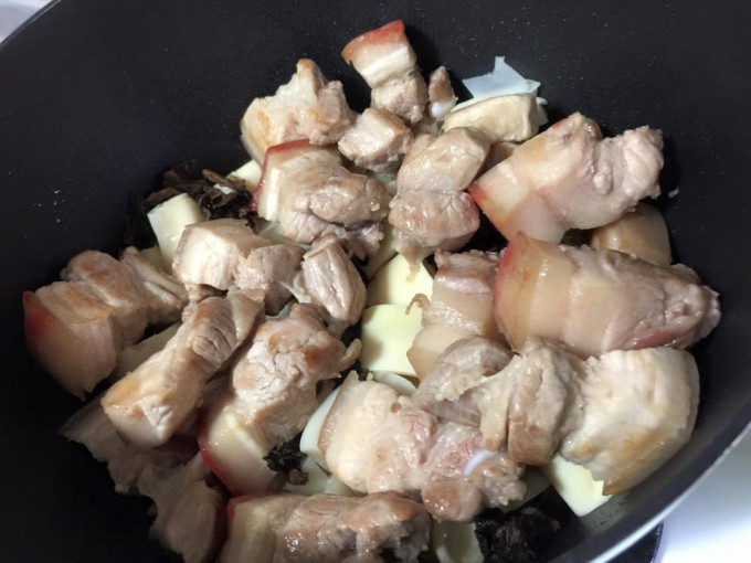 加入適量的冰糖、醬油與白胡椒調味。梅干菜本身在醃漬過程中已有鹹味,會隨著燉煮時間加長而釋出,所以調味時要先嚐過味道再加入醬油喔!然後轉成小火燉煮40分鐘即可