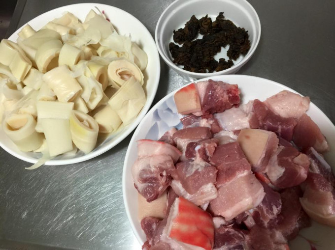 將梅干菜、桂竹筍、豬五花肉切成合適大小