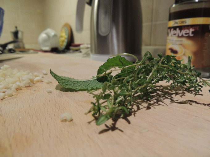 蒜瓣,薄荷,百里香切碎,備用。