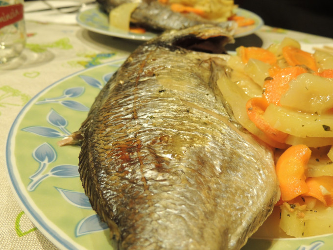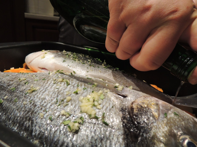 再鋪上魚,將剩下的香草跟蒜末均勻塗抹魚腹內跟魚皮上面,灑些白酒跟少許橄欖油。