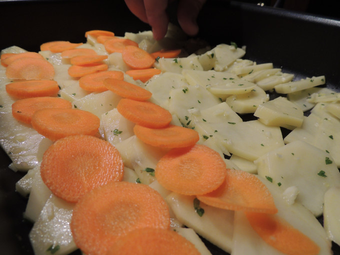 然後舖上紅蘿蔔片, 如圖所示。