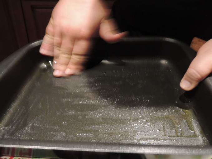 取一烤盤,滴少許橄欖油,塗抹均勻,同時烤箱預熱180度。