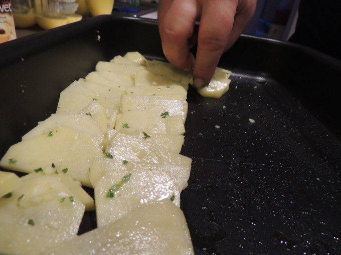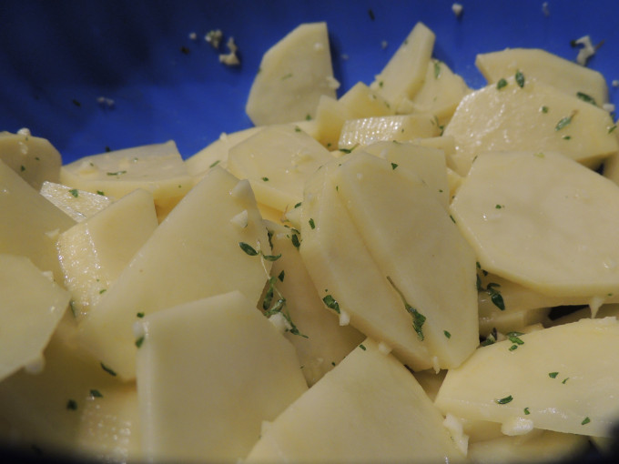 取一碗盆,放入馬鈴薯片,再放入部分的切碎的香草跟蒜末,灑少許鹽,拌勻備用。