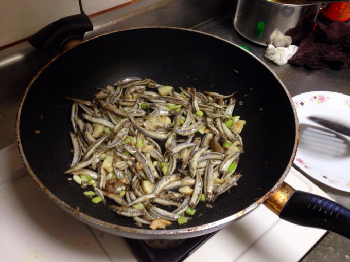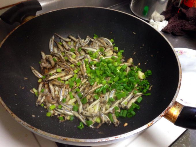 加入蔥白末一起翻炒(為了使丁香魚能炒久一點,味道比較香又不至於烤焦,將食材依序加入達成降溫作用)