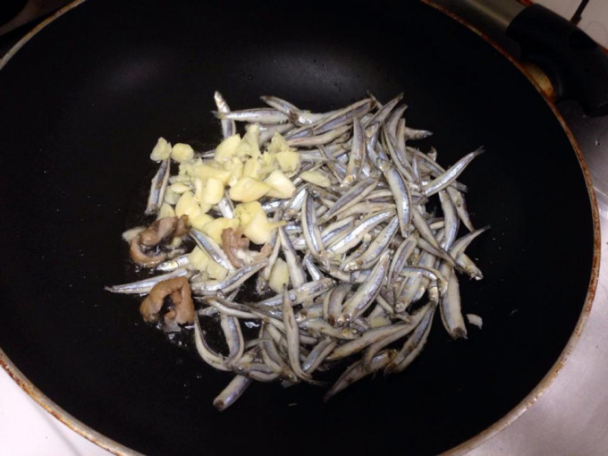 將蒜頭稍微切碎之後,和丁香魚一起放入鍋內以中火慢慢翻炒