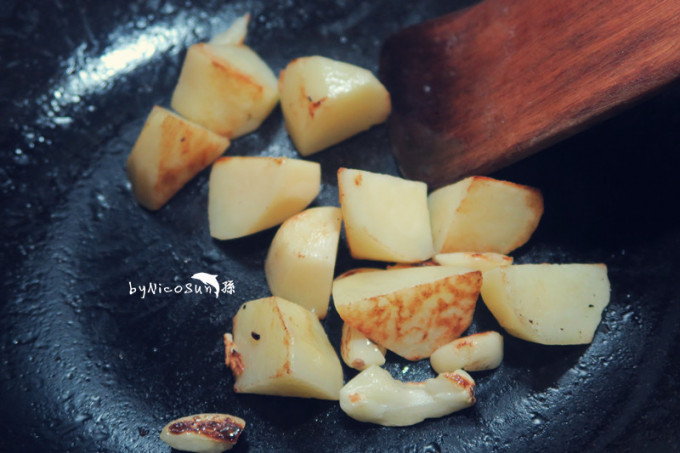 起油鍋倒入橄欖油.馬鈴薯大蒜煎上色