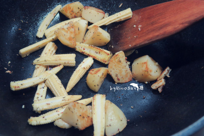 放入玉米筍拌炒.撒上迷迭香料.少許鹽巴調味