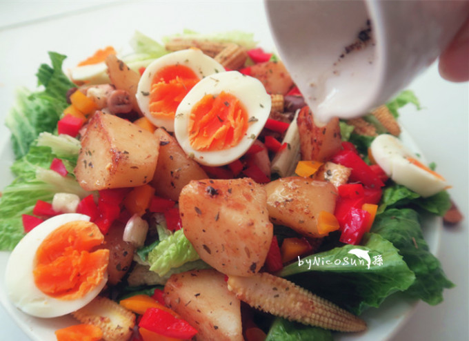 乾煎過的馬鈴薯.撒上特殊香氣的迷迭香.搭配生菜.淋上清爽的檸檬醬汁.清爽沒有負擔.是一道可當作正餐的溫沙拉.
