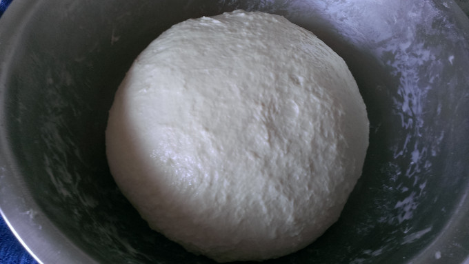 將高筋麵粉+低筋麵粉拌勻,然後加入鹽和酵母粉,再慢慢加入2/3的水量,邊加水,邊拌麵粉,再加入橄欖油,拌一下,再慢慢加入剩下的水,揉成一個不黏手表面光滑的麵糰,將麵糰表面噴少許的水,蓋上保鮮膜或蓋子,讓麵糰發酵30分鐘,或發酵成原麵糰的2倍大。