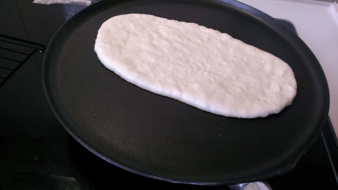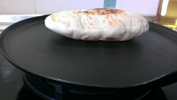 平底鍋小火加熱,將麵糰桿成長橢圓形薄片,先烙30秒再翻面烙1分鐘,再翻一次面,麵皮會慢慢鼓起