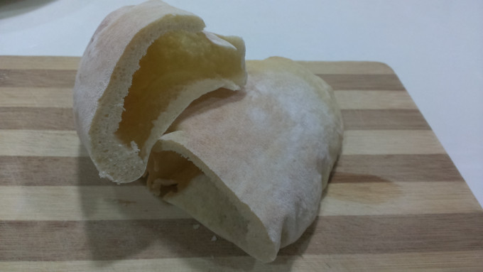 將放涼的口袋餅,從中間切開,再放入喜歡的食材,就能夠食用了。