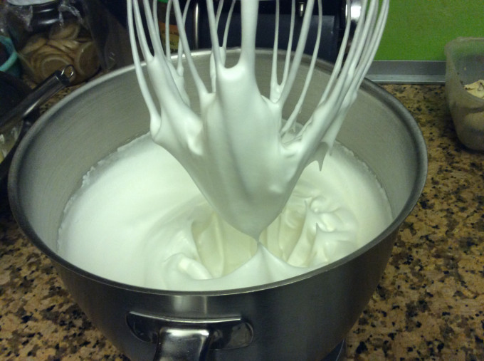 蛋白分次加入糖打發。然後分二次與蛋黃麵糊快速而輕柔的拌勻。最後加入烤過的南瓜子。
