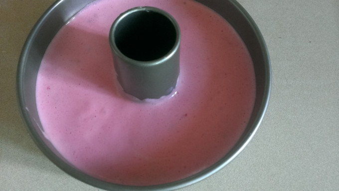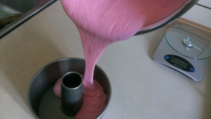 把烤模在桌上敲兩下敲出大氣泡,再用竹籤在麵糊中畫8字,讓底部氣泡往上浮。送進烤箱以180度烤10分鐘,再轉160度烤30-35分鐘,竹籤插入沒有沾黏蛋糕糊就是烤熟囉!