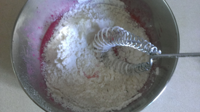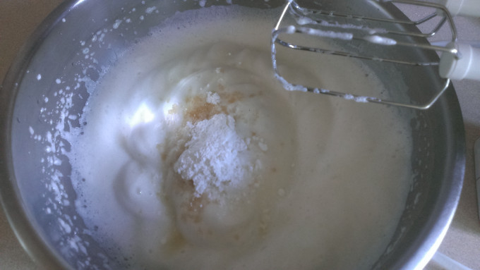 最後蛋白泡沫略成稠狀,加入蛋白麵糊中的檸檬汁、玉米粉與剩下1/3的砂糖,快速攪打10秒鐘