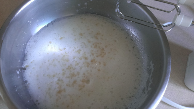 再次攪打到泡沫略呈細緻,再加入1/3砂糖