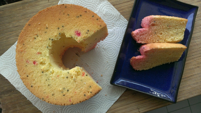 戚風蛋糕很有彈性,可以沿著圓模按壓一周(或用尖刀貼模壁畫一圈),從分離模下方往上一推,最後拿較扁平的尖刀,在烤模底盤畫一圈,就可以輕鬆脫模了!