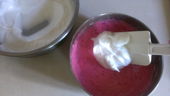 步驟7拌勻的麵糊倒入打發蛋白中,使用調拌刀已「切」、「拌」的方式,把底線麵糊翻起與上層麵糊攪拌,這時候動作要快速,避免攪拌過度消泡了