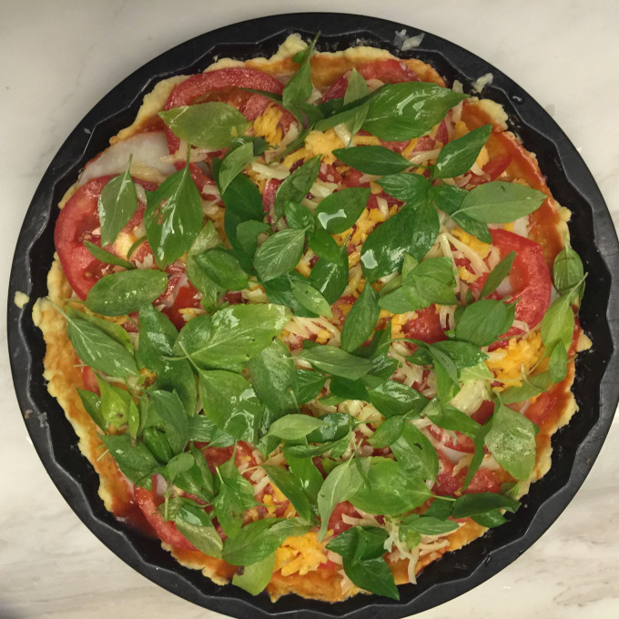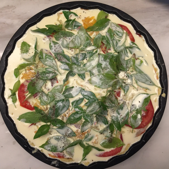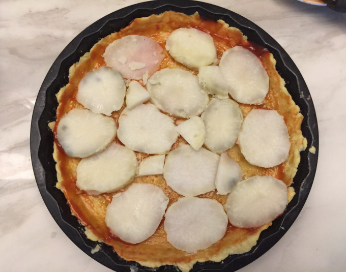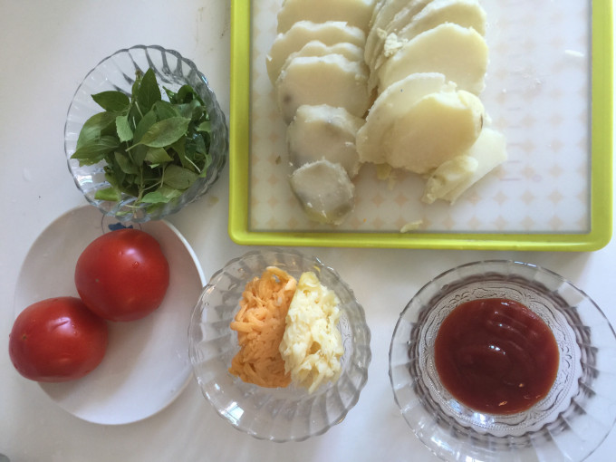 餡料:馬鈴薯蒸熟去皮,切成0.5公分厚薄片,蕃茄切薄片(最好去籽才不會太濕),羅勒去梗洗淨備用