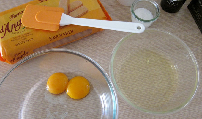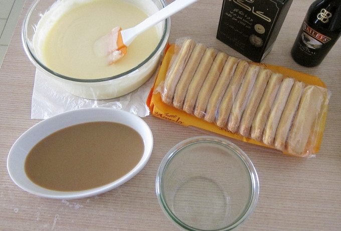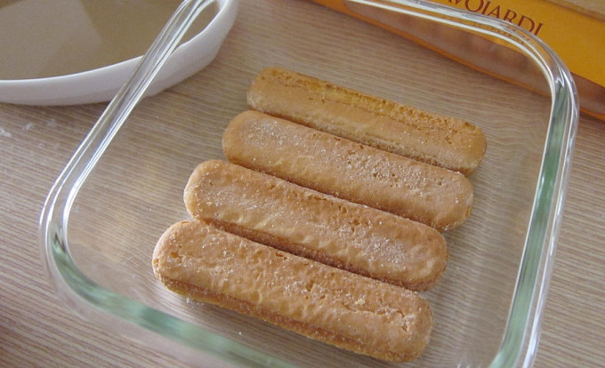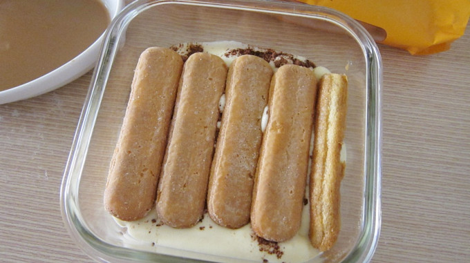 快速地把手指餅乾兩面都沾點奶酒咖啡,然後排排進容器中。