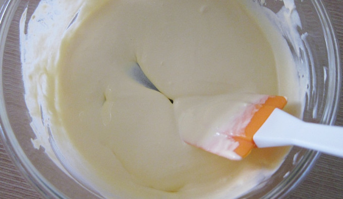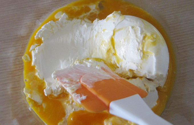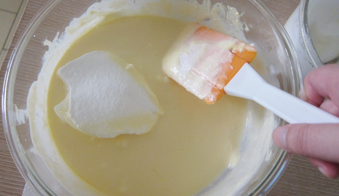 打發的蛋白霜分次慢慢混合到蛋黃起士醬裡,拌勻至順滑程度備用。
