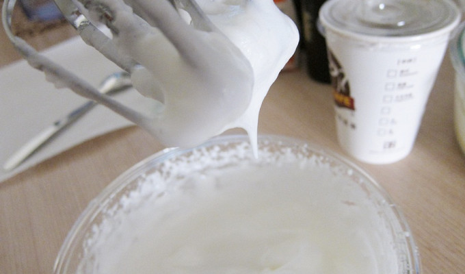 打發到蛋白霜拉起不掉落、堅挺狀態。
