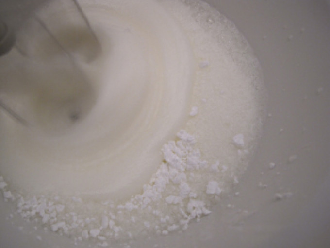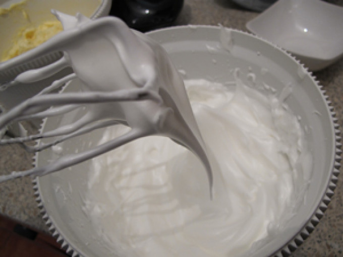 在無油無水的乾淨容器中,蛋白中加入新鮮檸檬汁,由慢速轉高速,邊打邊慢慢加入剩餘的60g糖,將蛋白打成雪花狀的蛋白霜,直到可以切開。