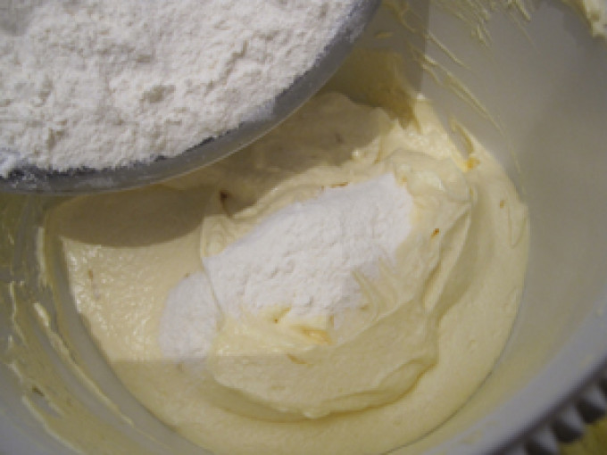 加入準備好的檸檬皮屑與香草精。用打蛋器拌入過好篩的乾粉:麵粉,玉米澱粉,泡打粉。