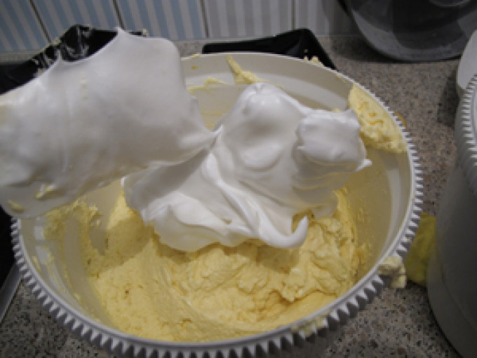 (白入黃)取三分之一的蛋白霜加入蛋黃糊中,用手動打蛋器,由下往上,仔細拌合。手法要輕。
