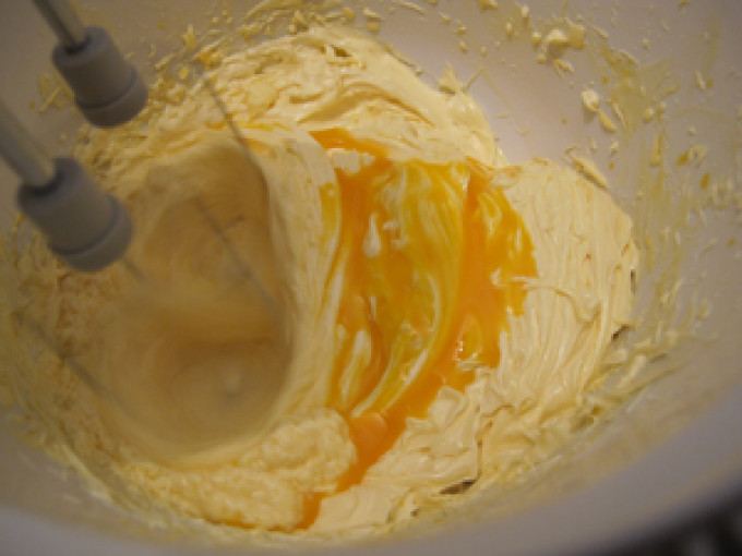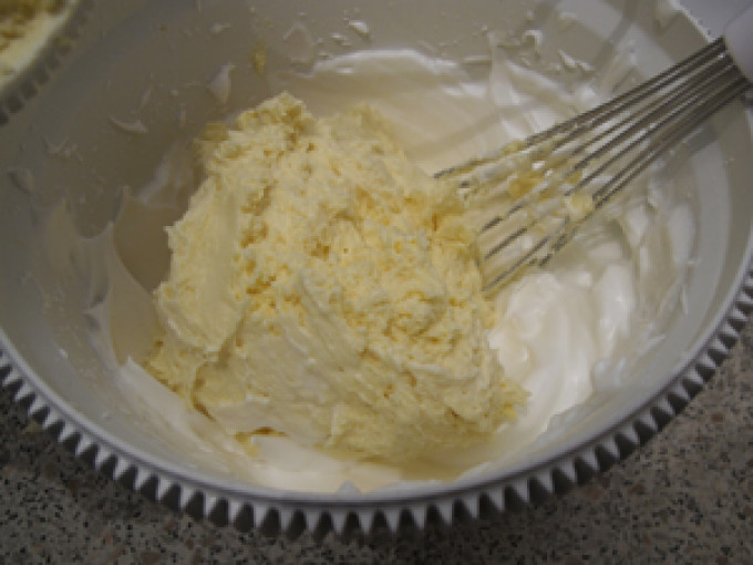 奶油中加入蛋黃打發成蛋黃奶油霜。