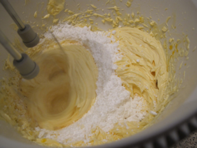 取約一半的糖粉,分多次加入,每次加入都要仔細攪拌。確定糖粉與蛋黃奶油霜完全融合。
