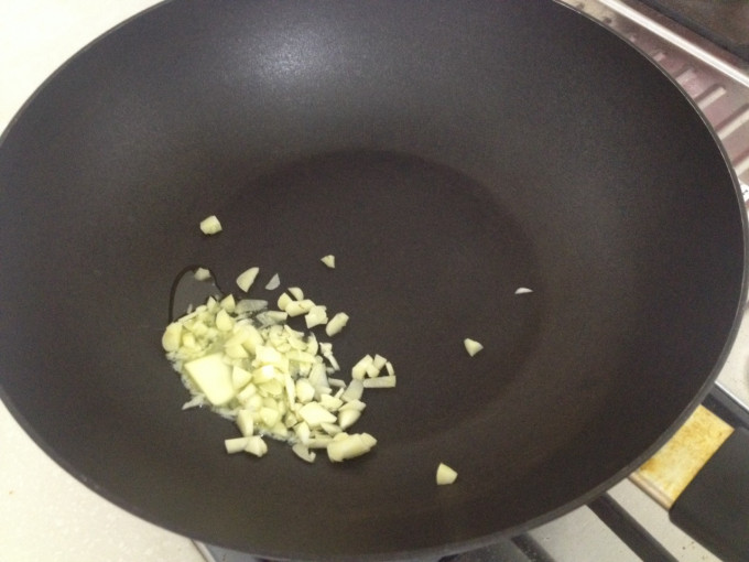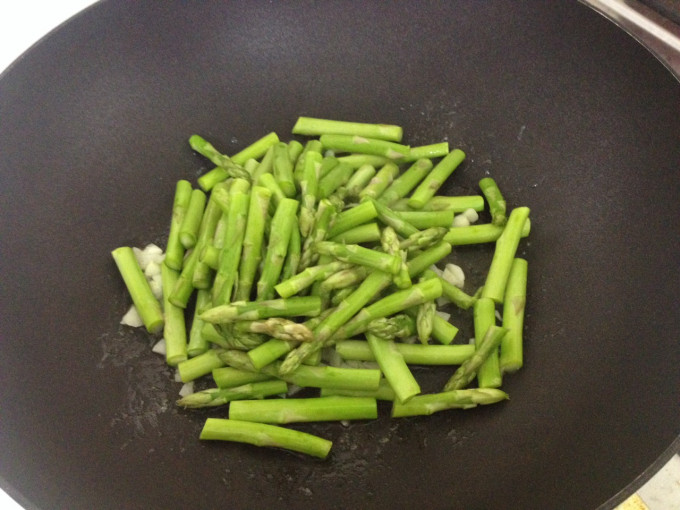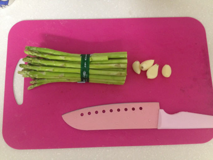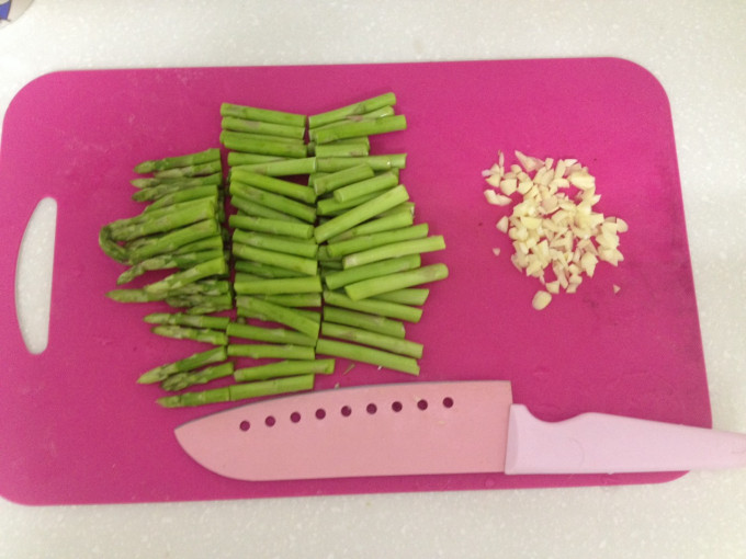 清洗乾淨後,蘆筍切段、蒜頭切粒