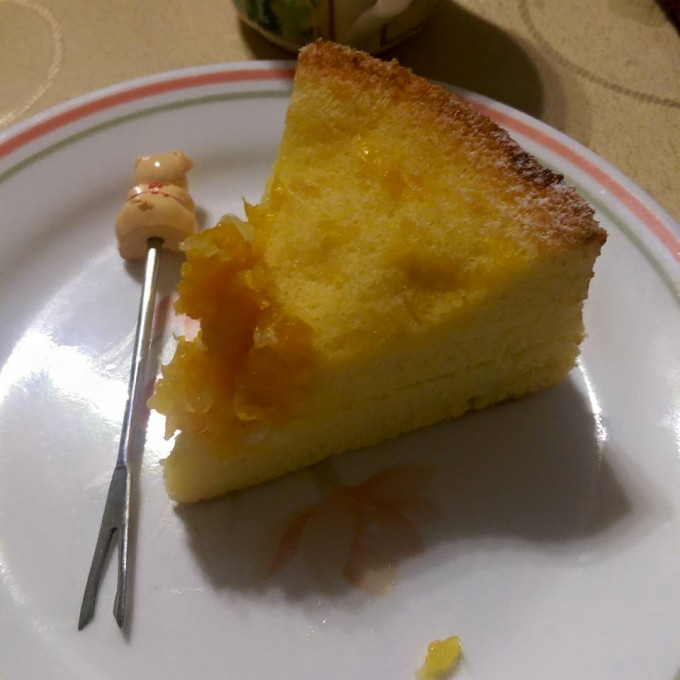 將步驟1之果肉平鋪於蛋糕上方(蛋糕模的底部作為蛋糕上方,會比較平整)