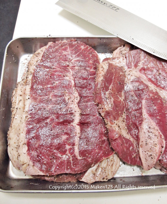 退冰後的牛排,用刀背拍鬆兩面,筋的部分,用刀切個幾刀,