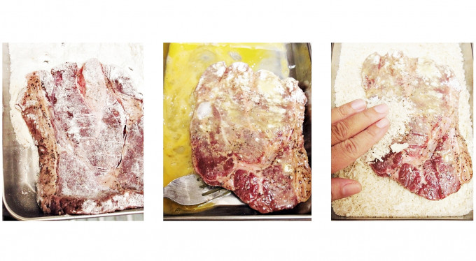 把醃好的牛排依序沾上麵粉蛋液和麵包粉,