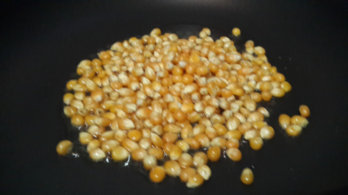 待油紋出現後.加入玉米粒.用鍋鏟輕拌至膨脹