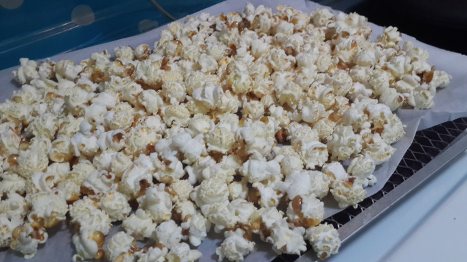 將爆完的爆米花挪出鍋子.盡量攤開散去熱氣(以免燜住會不脆喔)!!