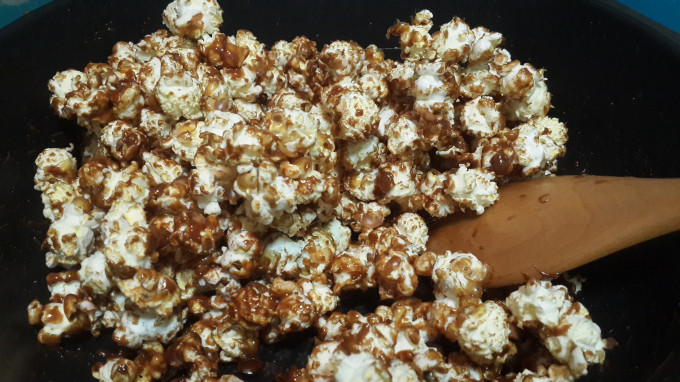 將爆米花放回鍋中.用兩隻鍋鏟或湯匙迅速拌勻焦糖.盡量讓每顆花都有附著糖衣