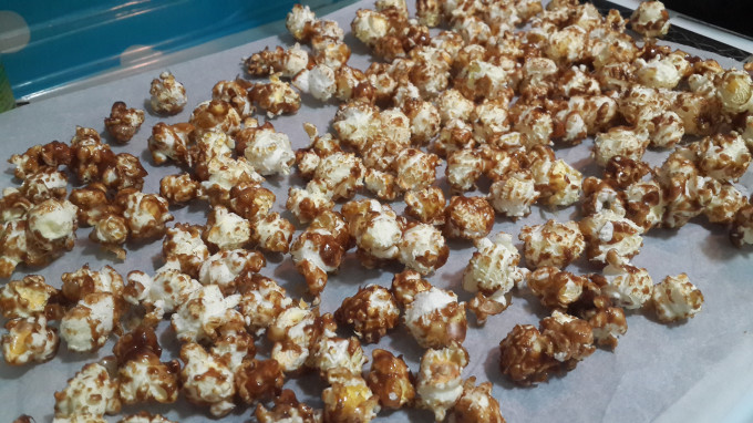 拌勻後的爆米花挪出鍋外攤開散熱.待涼冷卻後焦糖衣就會脆脆的囉!!